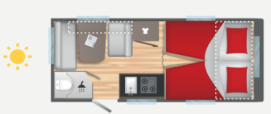 Lehký karavan ideální pro 2-4 osoby s rozložitelným sezením, koupelnou vybavenou WC, umyvadlem a sprchou v zadní části a v přední části s podélným spaním. Součástí výbavy je také topení a ohřev teplé vody. Karavan je možné připojit za téměř každé tažné vozidlo.