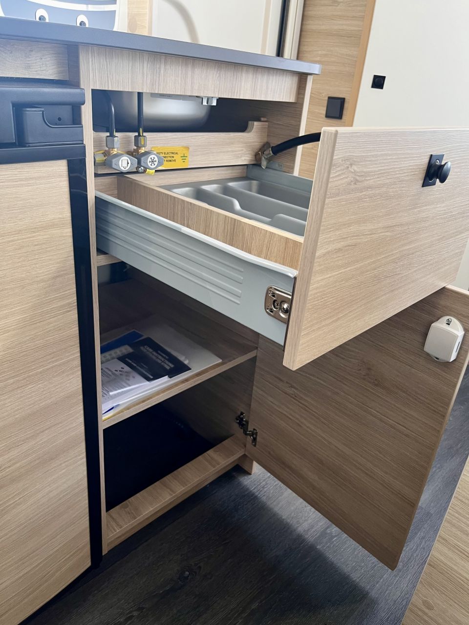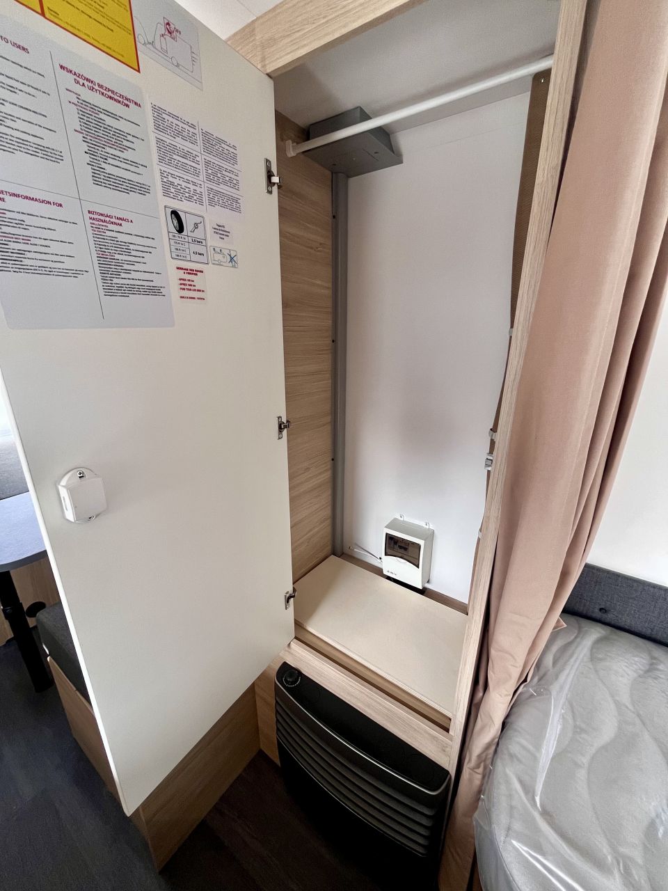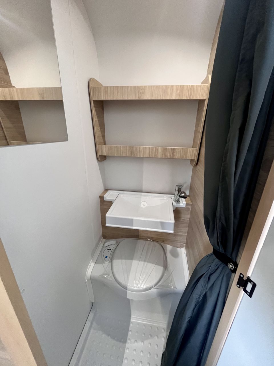 Lehký karavan ideální pro 2-4 osoby s podélným spaním a rozložitelným sezením, koupelnou vybavenou WC, umyvadlem a sprchou v zadní části a v přední části s podélným spaním. Součástí výbavy je také topení a ohřev teplé vody. Karavan je možné připojit za téměř každé tažné vozidlo.