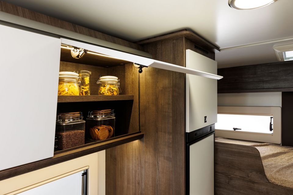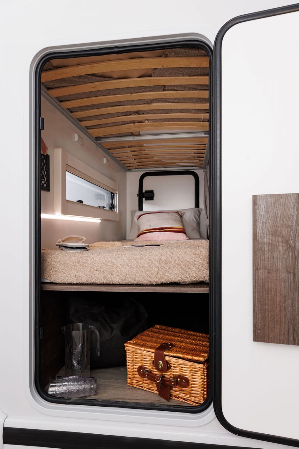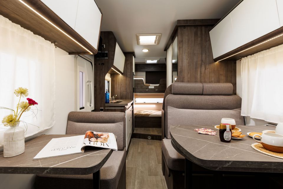 - klimatizace, dvojité lůžko v alkovně, palandy v zadní části, rozložitelné sezení